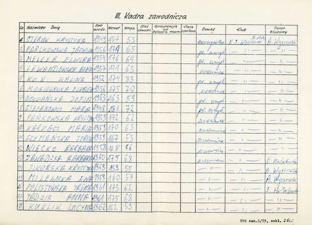 ” – To są notatki Pana Trenera z tamtego sezonu? – Tak, zrobiłem sobie taki mały szkic planu organizacyjnego. Co my tu mamy… <Zadania: awans do I ligi. Okres: sezon 1975/76 i 1976/77 (2 lata). Treningi: 10 godzin tygodniowo (obecnie), od przyszłego sezonu 16 godzin tygodniowo. Zapewnić zawodniczkom udział w treningach, zapewnić korzystanie z odnowy biologicznej, zapewnić godziny treningowe na hali przy ul. Jurowieckiej, zapewnić atrakcyjny obóz szkoleniowy w lipcu (Jugosławia, Bułgaria)>(…)”.